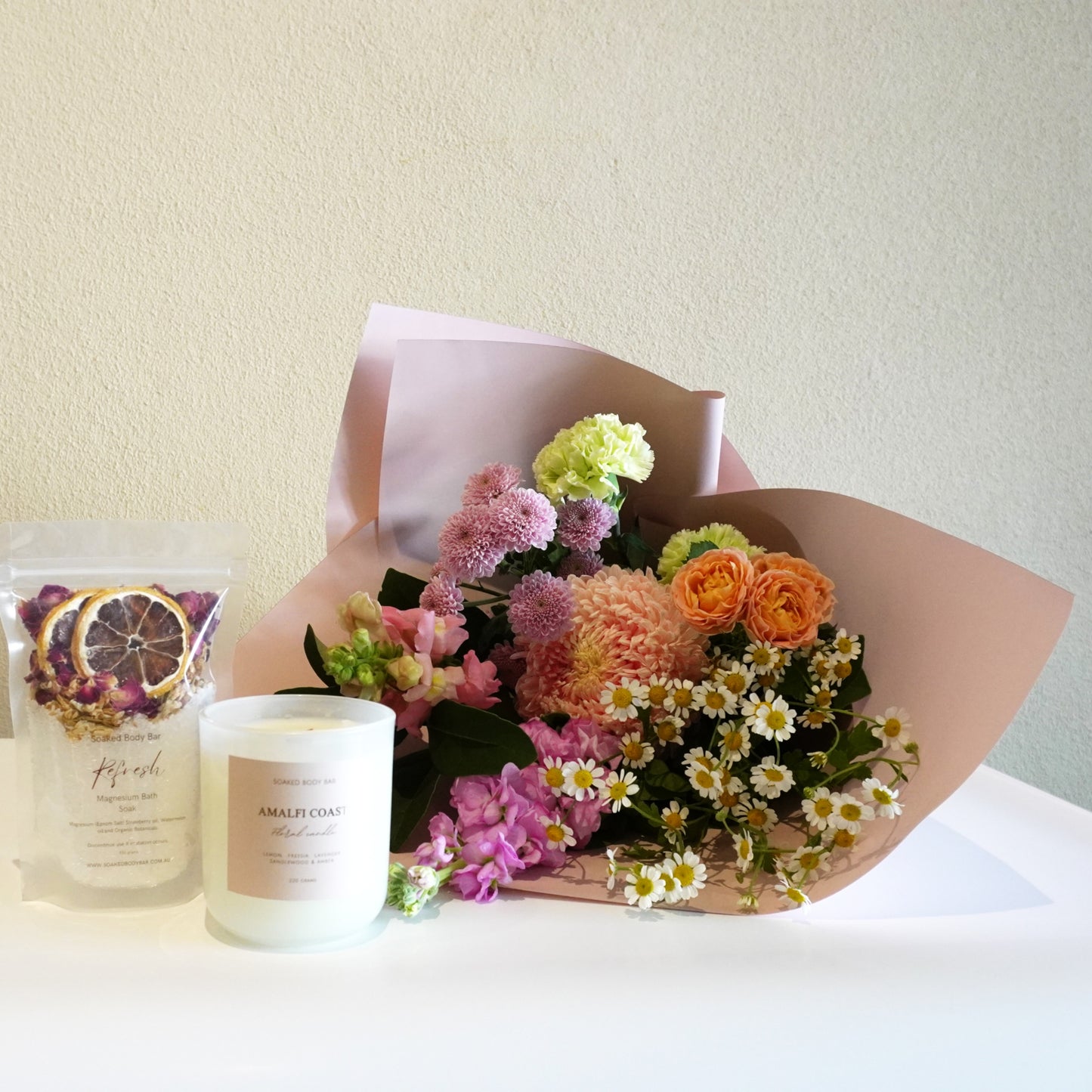 Bouquet of flowers and a candle on a white surface with a neutral background