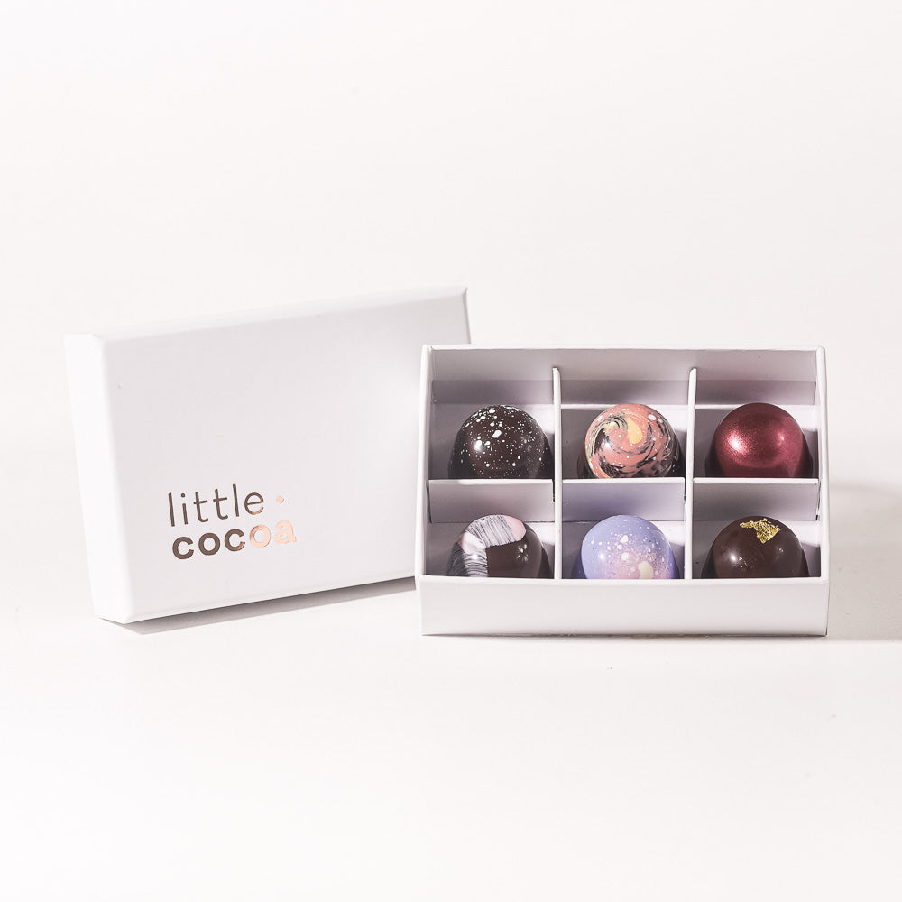 Elevate any occasion with Little Cocoa’s signature chocolate gift box. Inside, you'll discover twelve exquisite, handcrafted pralines, each a miniature work of art. Our chocolatiers have perfected six decadent fillings designed to delight the senses, making this the perfect gesture to say thank you, congratulations, or happy birthday.